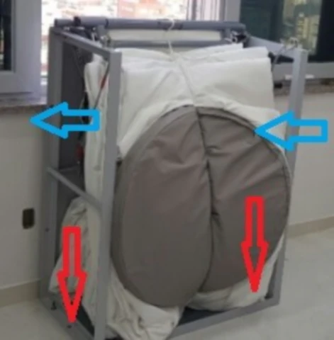 - 바닥 및 벽면에 지지 틀을 견고히 고정합니다. 바닥에 앙카볼트를 고정하고, 필요 시 아래 그림의 파란 화살표 방향으로 벽에 앙카볼트를 박아줍니다.