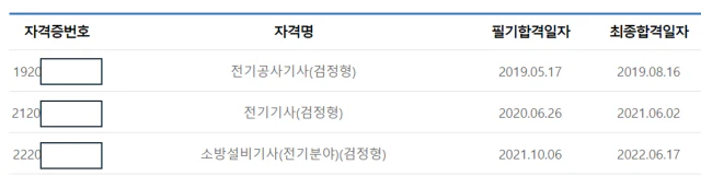 저는 전기기사, 전기공사기사, 소방설비기사(전기분야) 자격증을 취득했습니다. 전기공학과 전공자로서 가장 기본적인 자격증들을 취득한셈이죠. 직장을 다니고, 이직을 병행하여 자격증을 취득했기 때문에 필기, 실기 합격 기간의 차이가 있습니다.