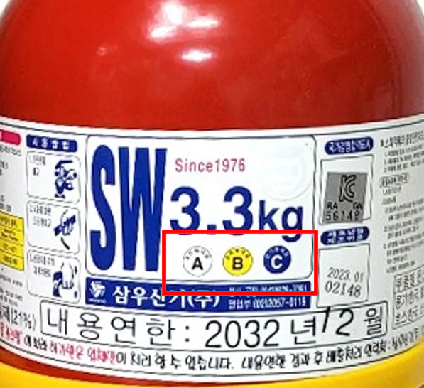 여기서 보통의 분말소화기는 ABC급을 담당합니다. A,B,C에 해당하는 화재를 모두 소화할 수 있다는 의미이죠. 일반 화재, 유류 및 가스화재, 전기화재를 소화할 수 있습니다. 분말소화기 표면에 ABC라고 적혀있는 것이 이 의미입니다.